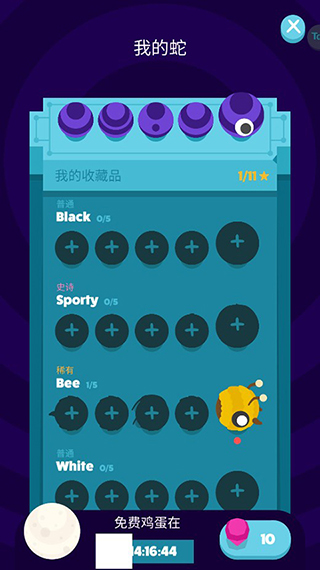 5、游戏还提供丰富的小蛇皮肤供玩家收集。这些皮肤可通过红宝石解锁,也可通过开启下方的免费鸡蛋获取。鸡蛋有时间限制,若想立即获得,也可使用红宝石直接购买。