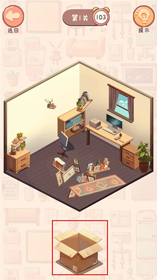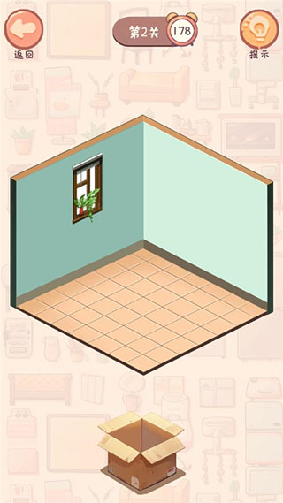 第一关中,点击屏幕上的盒子,会不断弹出各类家具和绿植,你需要在倒计时结束前将它们全部整齐摆放到位。