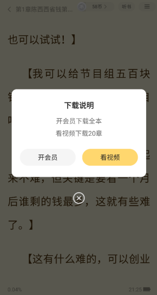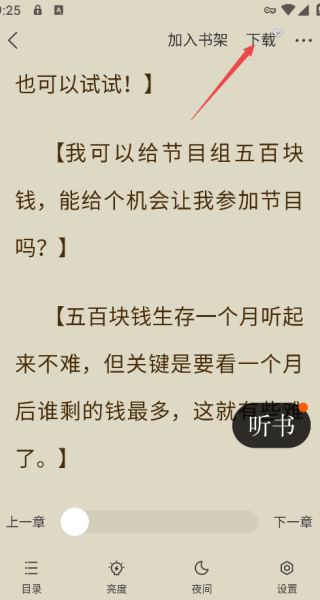 3、在小说阅读界面,点击任意位置,呼出功能菜单,我们只需点击上方的下载就行;