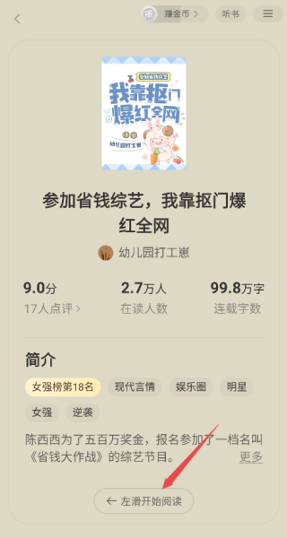 2、在小说详情界面,我们能够了解小说的简介,向左滑动,进入小说阅读界面;