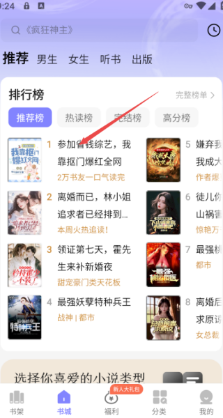 1、我们在推荐板块,能够筛选自己喜欢的小说,点击小说封面,进入详情界面;