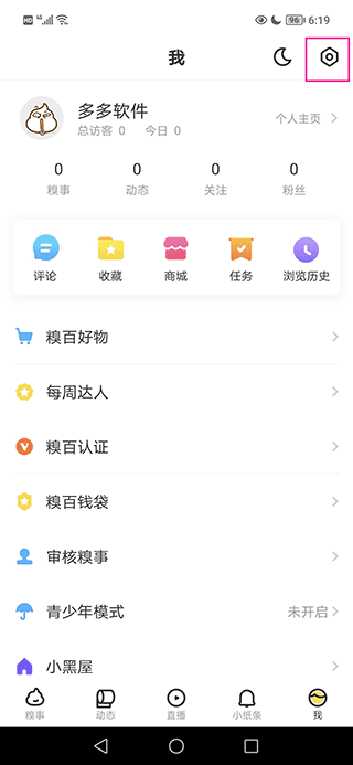 1、打开软件,点击右下角的“我”,进入个人页面后,点击右上角的齿轮图标;
