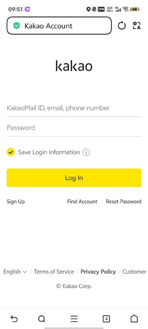 输入你的Kakao账号和密码,点击登录,即可完成注册流程。